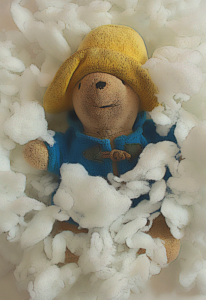De kussenvulling ging dus niet werken om pad blauw te redden. Te grove stukken en te groot. Pad blauw had het wel gehad op zolder en ging vast op weg naar beneden. Pad geel bleef nog even boven: hij vond het veel te leuk om te spelen met de vulling. Grote plukken vlogen door de lucht en je kon pad geel van een afstandje horen: 'sneeuw, sneeuw, sneeuw.' Hij was door het dolle.