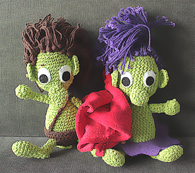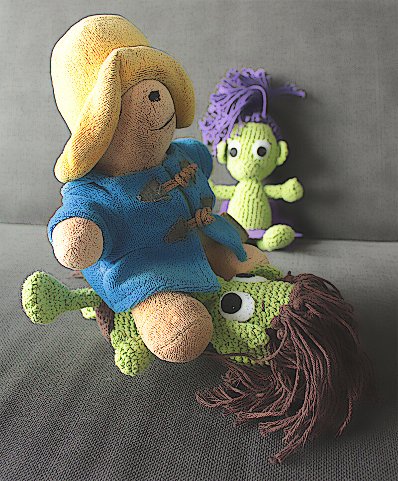 In korte tijd was de situatie volledig omgedraaid. De padden waren weer vrij en het gevaar was geweken. Pad blauw was bekomen van de schrik en ging even bij de gewonde trol kijken. En daar had hij zijn eureka moment. 'Pad geel, kom gauw kijken, ik denk dat ik de oplossing heb voor ons probleem.' Pad geel kwam er snel aangehobbeld. 'Kijk hier maar eens, in zijn buik. Dat is de vulwol die we zoeken, dat kan niet missen.'