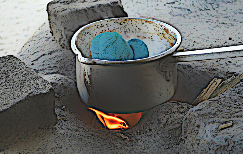 Pad geel was inmiddels uitgespeeld en ook onderweg naar beneden. Hij wilde graag aan pad blauw vertellen hoe leuk het was in de sneeuw. Maar op zijn geroep kwam geen antwoord. Hij riep nog eens in de veronderstelling dat pad blauw nog wel in de buurt was. Pad geel maakte zich nog geen grote zorgen. Pad blauw zou wel alvast naar beneden zijn gegaan. Hij ging dus ook op weg. Onderweg rook pad geel echter een vreemde geur. Het rook niet lekker. Pad geel stond stil om er even over na te denken. Inmiddels weten wij dat het dan wel een poosje duurt. Zou het soms een rottende wortel zijn? Of een dode muis? Er leek weinig anders op te zitten dan een kijkje te gaan nemen. Pad geel volgde zijn neus en liep de kleine kamer in. De geur werd sterker. Pad keek om zich heen en daar zag hij het. Een kookpot stond klaar en er stak een stukje blauwe stof uit. Zou dat... 'Pad blauw, ben jij dat?' Er kwam weer geen antwoord. Pad geel sloop voorzichtig dichterbij. Hij stak zijn hoofd over de rand van de kookpot en zag pad blauw in de pot. Zijn ogen waren dicht. Pad geel tikte zachtjes op de blauwe hoed. Langzaam opende pad blauw zijn ogen. De paniek stond erin. 'Wat is er gebeurt? Waarom stinkt het hier zo?' pad geel wilde nog wel tien andere vragen stellen, maar pad blauw was hem voor. 'Snel, haal me hieruit, ze komen zo terug.' Pad geel handelde snel en trok pad blauw uit de kookpot. Pad blauw schudde zijn vacht droog en ze waren klaar om er vandoor te gaan. 'Wacht, mijn jas!' Pad blauw kon er natuurlijk niet vandoor gaan zonder zijn jas. Ze keken om zich heen en daar hing de jas inderdaad. Met zijn jas weer aan was pad blauw er nu echt klaar voor.