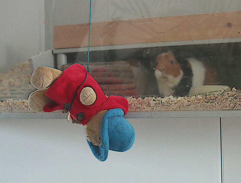 Dat wordt nog een hele toer denkt pad blauw als hij de hoogte van het caviahok in ogenschouw neemt. 'Kom pad geel, geef me eens een pootje'. Pad geel maakt een opstapje van zijn pootjes, maar dat helpt niet veel. Pad blauw komt zo'n 10 centimeter hoger, maar dat is lang niet genoeg. We zullen het dus anders moeten aanpakken denkt hij. Als we eerst eens op de eettafel klimmen. Zo gezegd, zo gedaan en even later staan de padden op de grote houten tafel. Die is de juiste hoogte, maar ze moeten nog steeds een grote afstand overbruggen naar het caviahok. Dan krijgt pad geel ineens een idee. Dat gebeurt niet vaak, dus dit is een bijzondere gebeurtenis! 'Als we nu eens een paar draden spannen van hier naar de cavia's, dan kunnen we daaroverheen klimmen,' stelt hij voor. Pad blauw vindt het een gevaarlijk plan, maar er zit weinig anders op. Ze kunnen tenslotte niet vliegen.