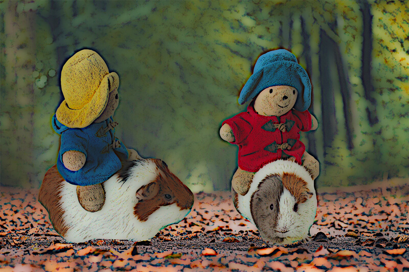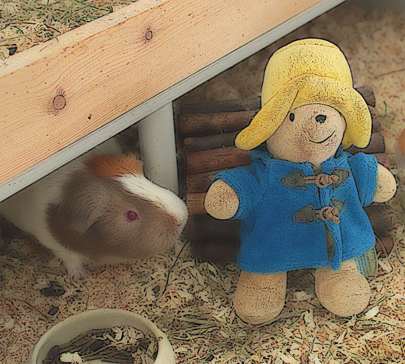 De padden zitten op de bank en kijken de cavia's aan. Die piepen terug. Pad geel knort en merkt op dat hij best trek heeft gekregen. Gelukkig heeft pad blauw nog een wortel op zak, en hij deelt die met pad geel. Ze knabbelen een poosje in stilte, terwijl de commotie in het caviahok toeneemt. Pad blauw stoot pad geel aan. 'Ik lijk er wel iets van te kunnen verstaan, jij ook?' Pad geel houdt zijn hoofd wat schuin en trekt een intelligent gezicht. 'Ja, nu je het zo zegt, ik geloof het wel,' zegt hij. 'Ze vragen of we wat dichterbij willen komen. En ze zeggen dat ze ons willen helpen'.