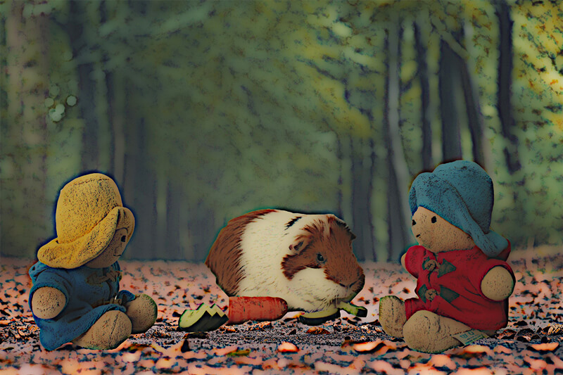 Als pad blauw ook weer in orde is overleggen ze met zijn vieren. 'Wij wonen al ons hele leven op het zaagsel en het is hartstikke zacht,' zegt Baerke, 'zou dat misschien de oplossing kunnen zijn voor jullie zoektocht naar padden vulling?' Pad blauw pakt een handje zaagsel en vindt het ook wel lekker zacht. 'Het zou best kunnen,' beaamt hij, 'maar we zullen aan de ouwe gele moeten vragen of het echt goed is.' Zuchtend laat hij zich achterover zakken in het zaagsel. 'Moeten we weer helemaal naar het berenbos toe, wat een eind.' Mimi schiet echter te hulp. Ze biedt aan om de padden te brengen. 'Maar dat kost jullie wel een halve komkommer en 2 witloffen.' De padden gaan snel akkoord, want op de rug van de cavia zijn ze zo bij de ouwe gele en er is haast geboden. En die komkommer en witlof? Die pikken ze gewoon uit de koelkast. Zo keren de padden dus per cavia terug naar de ouwe gele.
